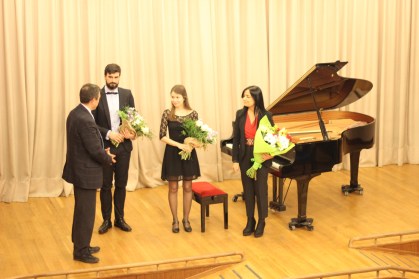 El presidente de la Fundación Tomás Moro, felicitando a los intérpretes y a la Catedrática.