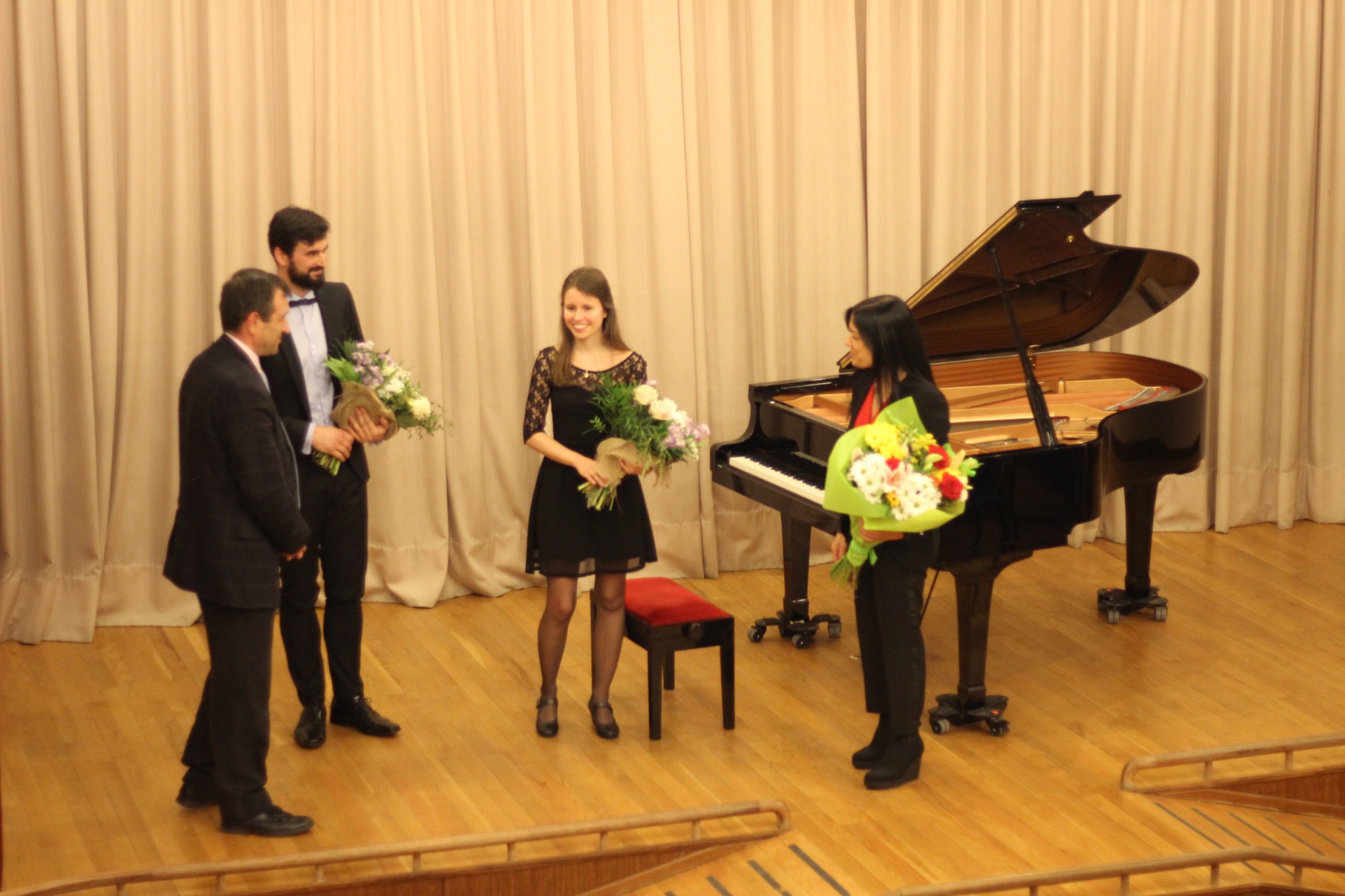 El presidente de la Fundación Tomás Moro, felicitando a los intérpretes y a la Catedrática.
