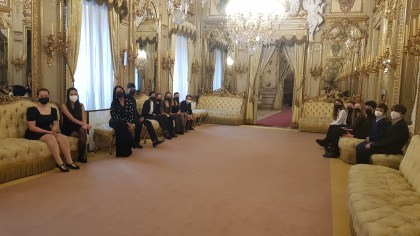 Esther Sestelo y los alumnos, antes del Homenaje, en la parte noble del Palacio