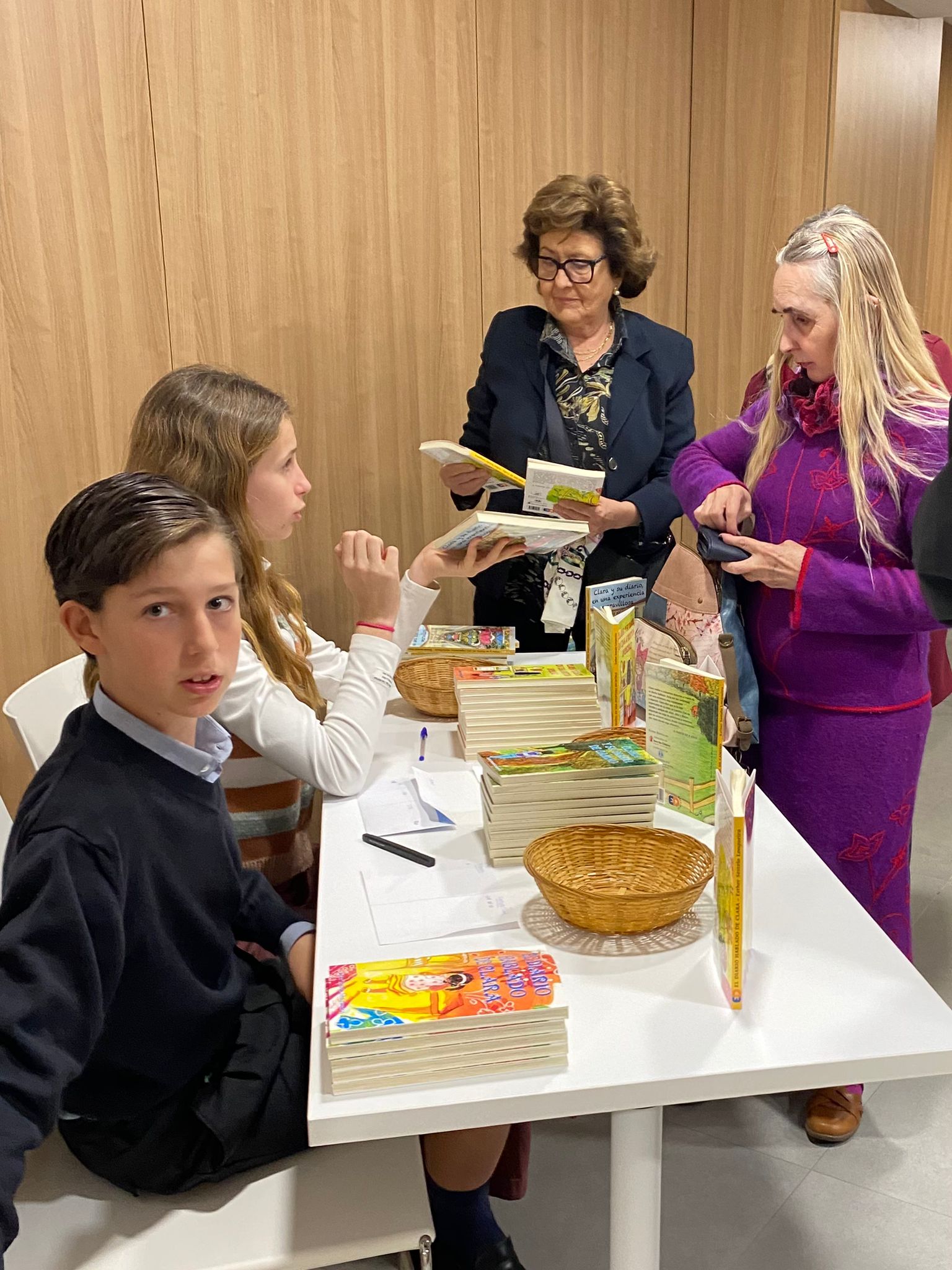 Los hermanos Olmo Simón, antes del acto, vendiendo los libros al público.
