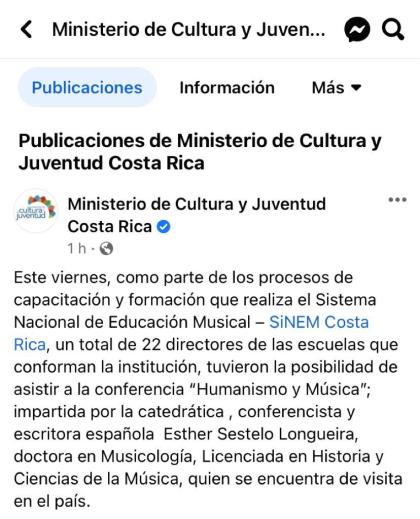 Nota de prensa del Ministerio de Cultura y Juventud de Costa Rica