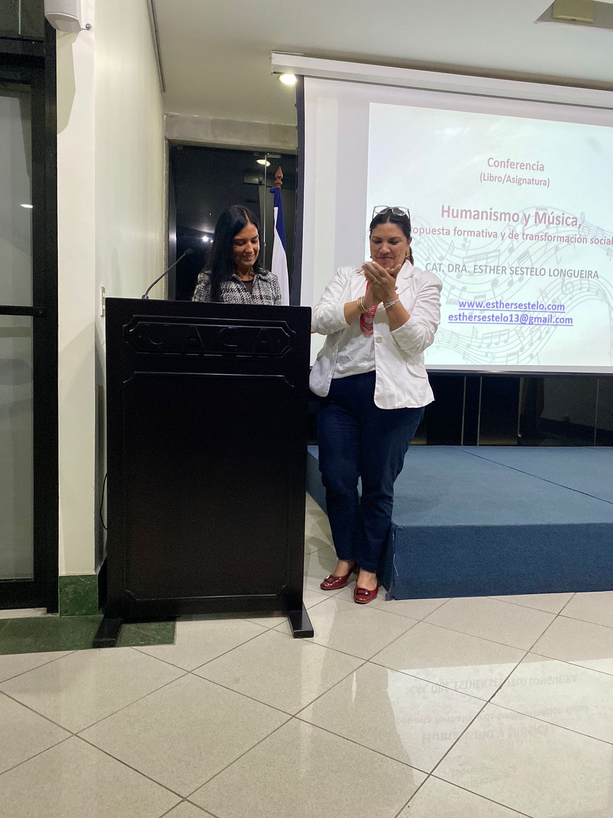 Al final de la conferencia, aplausos y felicitaciones con parte de Maureen Coto y toda la audiencia