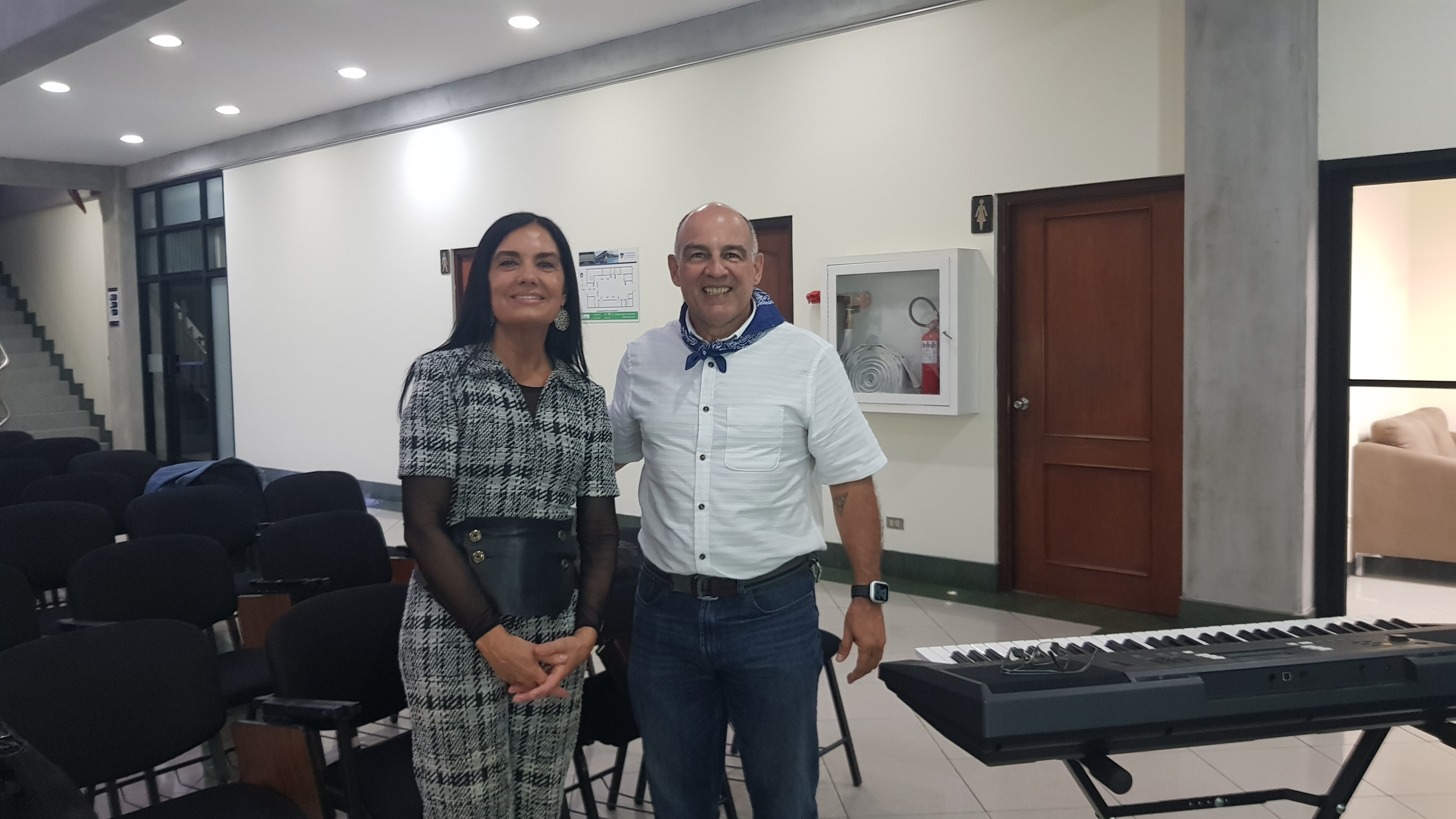 Esther Sestelo, con el Director del Coro, Humberto Malavassi, hijo del rector y fundador de la UACA, Guillermo Malavassi, antes de la conferencia